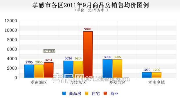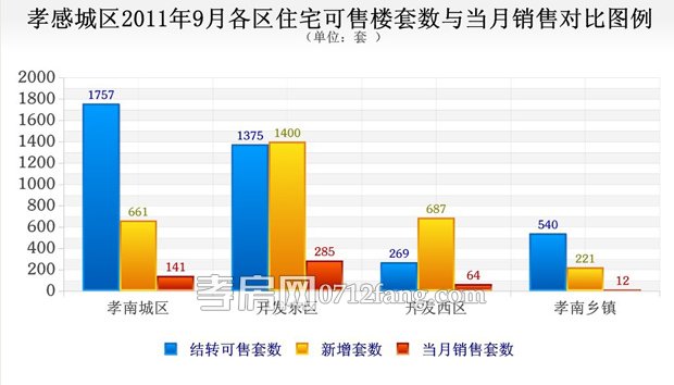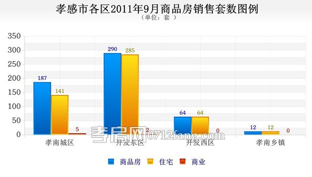 據(jù)孝房網(wǎng)www.searsglobal.com研究的統(tǒng)計(jì)數(shù)據(jù)顯示,2011年9月 (9月1日——9月30日),孝感市城區(qū)(注:本篇城區(qū)為孝南城區(qū)、開發(fā)東區(qū)、開發(fā)西區(qū)、孝南鄉(xiāng)鎮(zhèn)統(tǒng)稱)商品房共成交583套,環(huán)比銷量上漲25.92%,成交均價(jià)為3371.68;其中商品房住宅成交502套,商鋪成交7套;車庫(kù)成交26套。截至到9月30號(hào)全市住宅可售房源6910套,其中孝南城區(qū)可售2418套,開發(fā)東區(qū)可售2775套,開發(fā)西區(qū)可售956套,孝南鄉(xiāng)鎮(zhèn)可售761套。