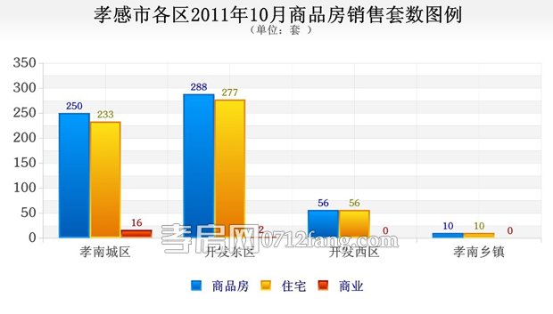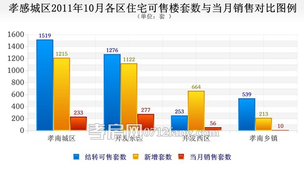 據(jù)孝房網(wǎng)www.searsglobal.com研究的統(tǒng)計(jì)數(shù)據(jù)顯示,2011年10月 (10月1日——10月31日),孝感市城區(qū)(注:本篇城區(qū)為孝南城區(qū)、開(kāi)發(fā)東區(qū)、開(kāi)發(fā)西區(qū)、孝南鄉(xiāng)鎮(zhèn)統(tǒng)稱)商品房成交量仍呈略漲趨勢(shì),共成交604套,環(huán)比銷(xiāo)量上漲3.6%,成交均價(jià)為3209.78元/平米;其中商品房住宅成交576套,商鋪成交18套;車(chē)庫(kù)成交2套。截至到10月31號(hào)全市住宅可售房源6801套,其中孝南城區(qū)可售2734套,開(kāi)發(fā)東區(qū)可售2398套,開(kāi)發(fā)西區(qū)可售917套,孝南鄉(xiāng)鎮(zhèn)可售752套。