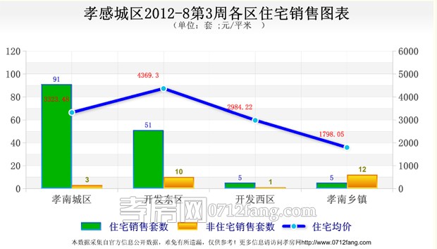 2012年8月3周(8月13日-8月19日)據(jù)孝房網(wǎng)研究的統(tǒng)計數(shù)據(jù)顯示,孝感城區(qū)商品房共銷售178套,銷售面積21159.72平米,銷售金額74900395.84元,銷售均價3539.76元/平米。其中住宅銷售為152套,銷售面積16256.72平米,銷售均價3610.24元/平米。非住宅銷售為26套,銷售均價3306.08元/平米。