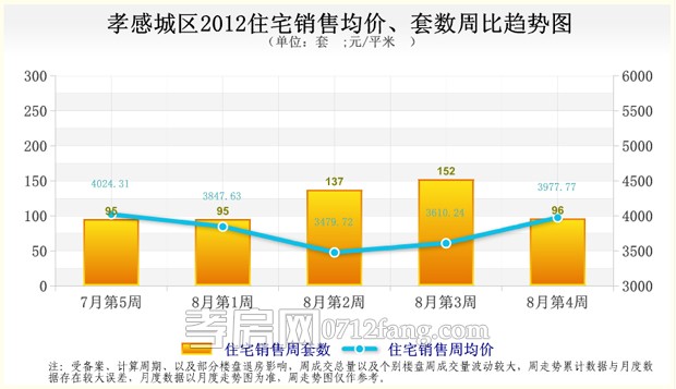 一周樓市走勢相關(guān)數(shù)據(jù)是以孝房網(wǎng)市場研究調(diào)研和統(tǒng)計處理得出,由于周價格受該周成交的樓盤及樓盤成交的具體房屋影響較大,故一周走勢能反映短期的變化狀態(tài),不能代表長期的走勢,供市民參考。