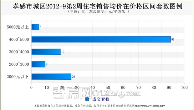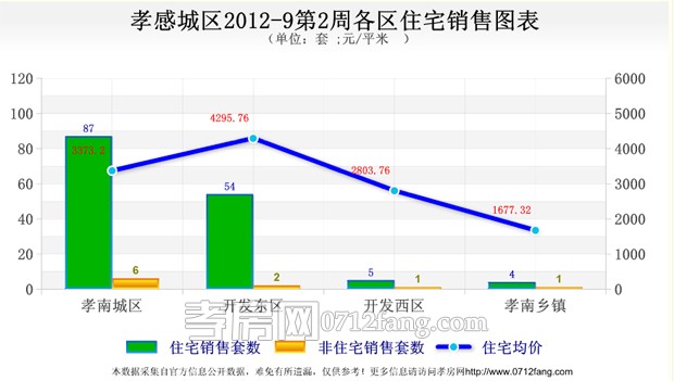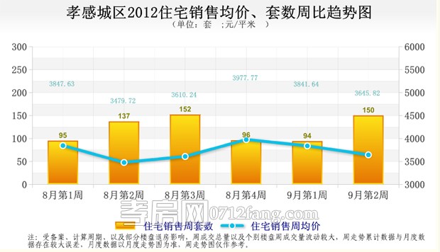2012年9月2周(9月3日-9月9日)據(jù)孝房網(wǎng)研究的統(tǒng)計(jì)數(shù)據(jù)顯示,孝感城區(qū)商品房共銷售160套,銷售面積18408.52平米,銷售總金額77259470.76元,銷售均價(jià)4196.94元/平米。其中住宅銷售為150套,銷售面積16841.37平米,銷售均價(jià)3645.82元/平米;非住宅銷售為10套,銷售均價(jià)10119.53元/平米。
