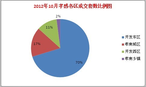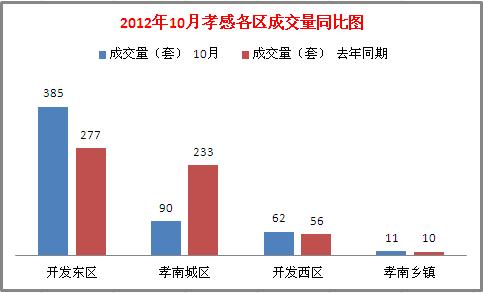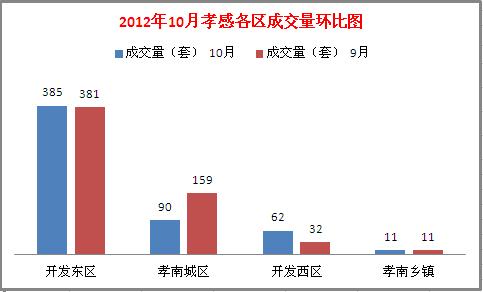 10月孝感各區(qū)住宅類房源成交套數(shù)排名從高到低依次是:開發(fā)東區(qū)385套(上月381),孝南城區(qū)90套(上月159),開發(fā)西區(qū)62套(上月32),孝南鄉(xiāng)鎮(zhèn)11套(上月11)。從各片區(qū)來看,開發(fā)東區(qū)所占市場份額高為成交大區(qū),近乎其它三區(qū)成交量總和的兩倍之多。