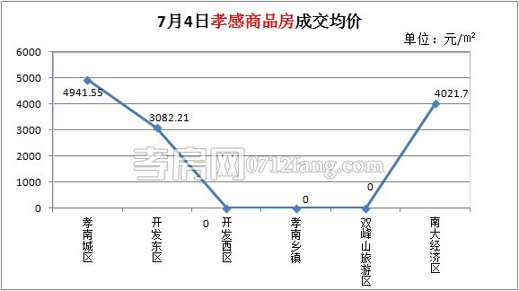7月4日,孝南城區(qū)商品房成交均價(jià)為4941.55元/㎡,開發(fā)東區(qū)為3082.21元/㎡,南大經(jīng)濟(jì)區(qū)為4021.7元/㎡。