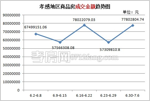 上周,孝感地區(qū)商品房成交金額為77802804.74元,形成了6月2日至7月6日這五周以來的小高峰,雖然不及6月16日至6月22日的總金額,但是大致相比于6月初的周的7天數(shù)據(jù)統(tǒng)計,上升了15.3%。