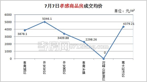 7月7日,孝南城區(qū)商品房成交均價為3878.1元/㎡,開發(fā)東區(qū)為5046.1元/㎡,開發(fā)西區(qū)為3409.88元/㎡,孝南鄉(xiāng)鎮(zhèn)為2298.26元/㎡,南大經濟區(qū)為4379.21元/㎡。