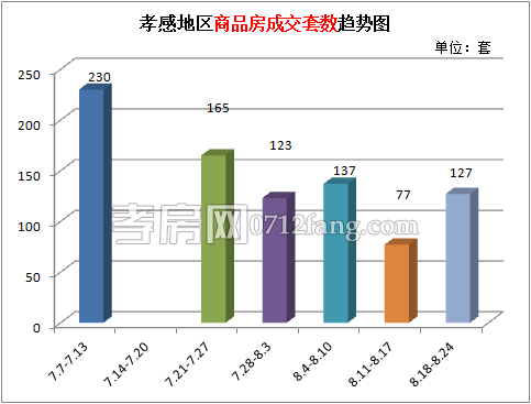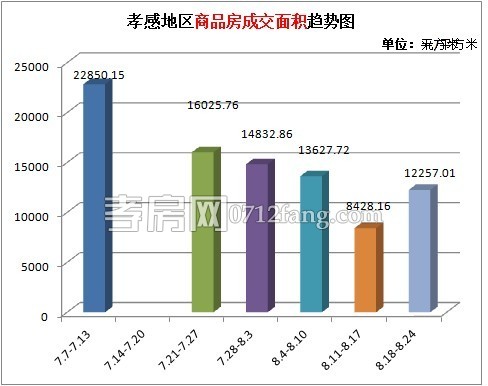 據(jù)孝房網(wǎng)數(shù)據(jù)研究顯示,從2014年8月18日到2014年8月24日,孝感地區(qū)銷售總交易記錄127套,面積為12257.01平方米,金額為46142238.77元,均價為3764.559元/平方米。