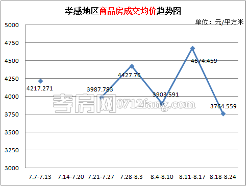 從8月18日到8月24日,孝感區(qū)域商品房成交均價為3764.559元/平方米。成交均價較上上周下降19.46%。成交均價在一定程度上能夠反映目前的購房狀況。上周的成交均價并非高或者低,而是在夏季樓市較為冷淡的情況下,在一個正常的值域內(nèi)進行的合理的波動。