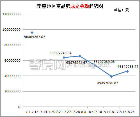 從8月18日到8月24日,孝感區(qū)域商品房成交金額為46142238.77元。成交金額較上上周上漲17.12%。從銷售面積、銷售均價均較上上周的情況來看,總金額也隨之增長是合理的。但是上周的銷量是下降的,從另外的角度考慮,房地產(chǎn)銷售的多元性,以及購房者在購房中也擁有自己的理性判斷與選擇。