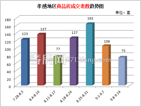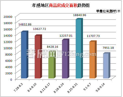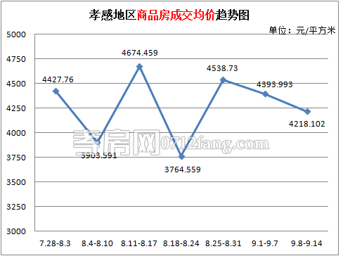 據(jù)孝房網(wǎng)數(shù)據(jù)研究顯示,從2014年9月8日到2014年9月14日,孝感地區(qū)銷售總交易記錄75套,面積為7951.18平方米,金額為33538885.8元,均價為4218.1元/平方米。