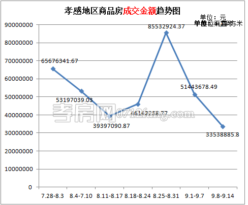 從9月8日到9月14日,孝感區(qū)域商品房成交金額為33538885.8元。成交金額較上上周下降34.8%。從銷售面積、銷售均價均較上上周的情況來看,總金額也隨之下降是合理的。上周的銷量是下降的,從另外的角度考慮,房地產(chǎn)銷售的多元性,以及購房者在購房中也擁有自己的理性判斷與選擇。