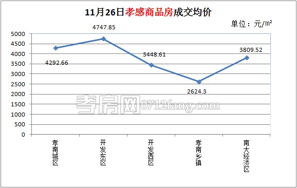 11月26日,全市的成交均價(jià)為4011.94元/㎡。其中開孝南城區(qū)為4292.66元/㎡,開發(fā)東區(qū)為4747.85元/㎡,開發(fā)西區(qū)為3448.61元/㎡,孝南鄉(xiāng)鎮(zhèn)為2624.30元/㎡,南大經(jīng)濟(jì)區(qū)為3809.52元/㎡。