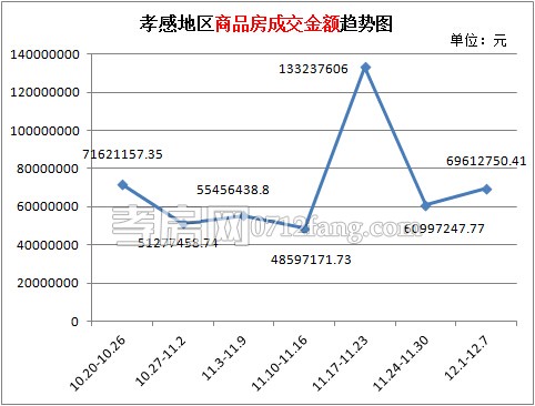 從2014年12月1日到2014年12月7日,孝感區(qū)域商品房成交金額為60997247.77元。成交均價(jià)的大幅回落,并未對(duì)成交金額產(chǎn)生影響,上周商品房成交金額漲幅明顯,較前一周環(huán)比上漲14.1%。這對(duì)于12月的孝感樓市來說是一個(gè)好兆頭,相信借助返鄉(xiāng)置業(yè)潮的契機(jī),在年關(guān)之際孝感樓市會(huì)越發(fā)紅火。