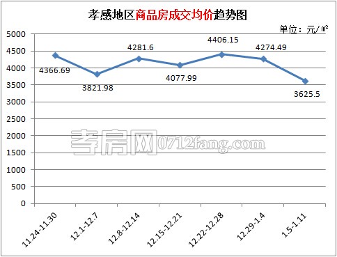從2015年1月5日到2015年1月11日,孝感區(qū)域商品房成交均價(jià)3625.5元/平方米。上周商品房成交均價(jià)大幅回落,對比前一周環(huán)比下降15.18%;對比近期低一周的3821.98元/平方米,仍下降了5.14%,上周商品房成交均價(jià)為近期低值。