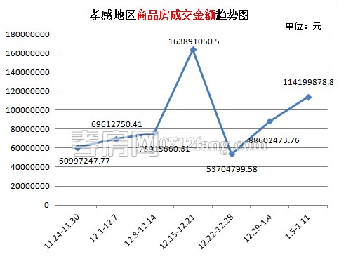 從2015年1月5日到2015年1月11日,孝感區(qū)域商品房成交金額為114199878.8元。成交均價(jià)的下滑并未影響到上周商品房的成交總金額,上周商品房成交金額隨成交面積大幅增長,對比前一周約上漲28.89%,從近七周來看,商品房成交金額變化較大,上周商品房成交金額有所增長。