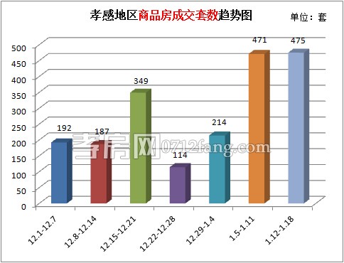據(jù)孝房網(wǎng)數(shù)據(jù)研究顯示,從2015年1月12日到2015年1月18日,孝感地區(qū)銷售總交易記錄475套,面積為50500.65平方米,金額為183008752.6元,均價為3623.89元/平方米。