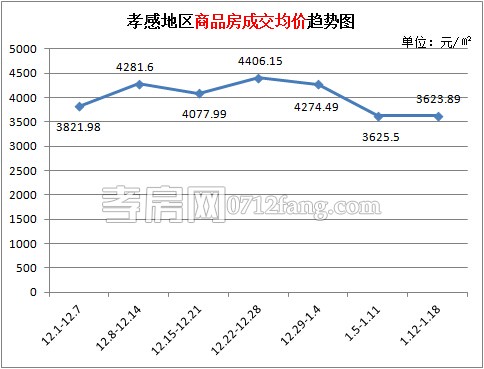 從2015年1月12日到2015年1月18日,孝感區(qū)域商品房成交均價3623.89元/平方米。上周商品房成交均價較前一周稍有降低但變化不大,創(chuàng)近期低成交均價??v觀近七周,樓市進入一月份,商品房成交均價開始降低,且降幅較大。