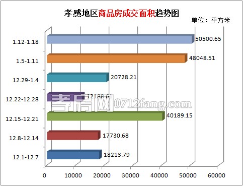 從2015年1月12日到2015年1月18日,孝感區(qū)域商品房成交面積為48048.51平方米。對比前一周,上周商品房成交面積約增長5.1%,越是十二月底低一周12188.61平方米的4倍。上周商品房成交面積有所增長。