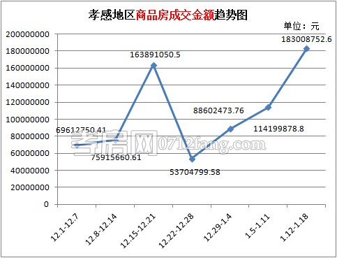 從2015年1月12日到2015年1月18日,孝感區(qū)域商品房成交金額為183008752.6元。雖然上周商品房成交套數(shù)、面積、均價較前一周變化都不大,但成交總金額卻增幅明顯,看來上周的商品房成交單價還是比較高的。上周商品房成交總金額交前一周環(huán)比上漲60.25%,創(chuàng)下了近期新高,繼續(xù)前兩周的上漲模式,可謂收獲頗豐。