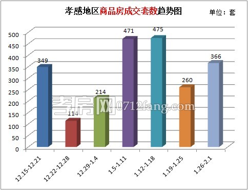 從2015年1月26日到2015年2月1日,孝感地區(qū)商品房成交366套。樓市進(jìn)入1月份,商品房成交量持續(xù)上漲,繼1月下旬次回落后,上周商品房出量再次攀升,對(duì)比前一周環(huán)比上漲40.77%。上周商品房成交套數(shù)上漲明顯。