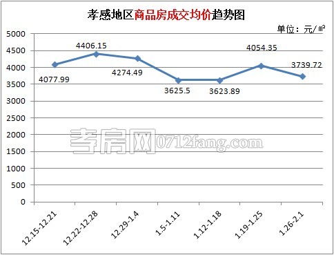 據(jù)孝房網(wǎng)數(shù)據(jù)研究顯示,從2015年1月26日到2015年2月1日,孝感地區(qū)銷售總交易記錄366套,面積為35545.66平方米,金額為1329107.14元,均價(jià)為3739.72元/平方米。