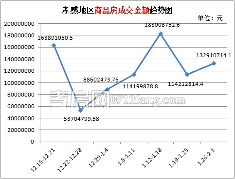 從2015年1月26日到2015年2月1日,孝感區(qū)域商品房成交金額為132910714.1元。從趨勢(shì)圖上面可以看出,近七周商品房成交總金額變化較大,自12月下旬持續(xù)上漲四個(gè)周突破1.8億元以后大幅回落,上周再次小幅上漲,對(duì)比前一周約上漲16.37%。上周商品房成交總金額小幅上漲。