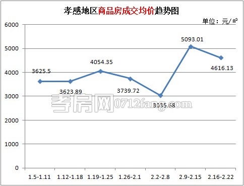 從2015年2月16日到2015年2月22日,孝感區(qū)域商品房成交均價(jià)4616.13元/平方米。上周商品房成交均價(jià)稍有回落,對(duì)比前一周環(huán)比下降9.36%,回歸正常。