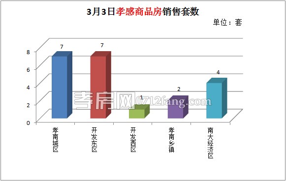 3月3日,全市的銷售套數(shù)為21套。其中孝南城區(qū)為7套,開發(fā)東區(qū)為7套,開發(fā)西區(qū)為1套,孝南鄉(xiāng)鎮(zhèn)為2套,南大經(jīng)濟區(qū)為4套。