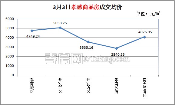 3月3日,全市的成交均價為4442.82元/㎡。其中開孝南城區(qū)為4749.24元/㎡,開發(fā)東區(qū)為5058.25元/㎡,開發(fā)西區(qū)為3535.16元/㎡,孝南鄉(xiāng)鎮(zhèn)為2840.55元/㎡,南大經(jīng)濟區(qū)為4076.05元/㎡。