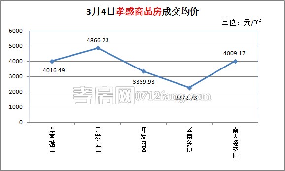 3月4日,全市的成交均價為3798.38元/㎡。其中開孝南城區(qū)為4016.49元/㎡,開發(fā)東區(qū)為4866.23元/㎡,開發(fā)西區(qū)為3339.93元/㎡,孝南鄉(xiāng)鎮(zhèn)為2272.78元/㎡,南大經(jīng)濟區(qū)為4009.17元/㎡。