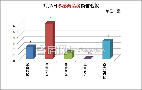 3月8日,全市的銷售套數(shù)為12套。其中孝南城區(qū)為2套,開發(fā)東區(qū)為6套,開發(fā)西區(qū)為1套,南大經(jīng)濟(jì)區(qū)為3套。