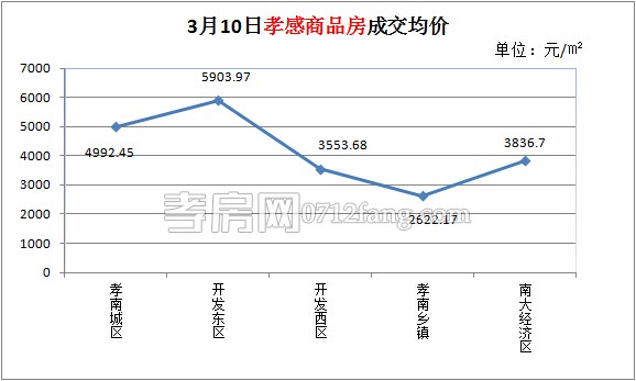 3月10日,全市的成交均價為4572.97元/㎡。其中開孝南城區(qū)為4992.45元/㎡,開發(fā)東區(qū)為5903.97元/㎡,開發(fā)西區(qū)為3553.68元/㎡,孝南鄉(xiāng)鎮(zhèn)為2622.17元/㎡,南大經(jīng)濟區(qū)為3836.70元/㎡。