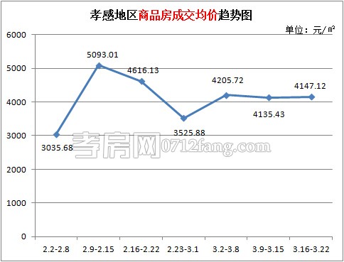 據(jù)孝房網(wǎng)數(shù)據(jù)研究顯示,從2015年3月16日到2015年3月22日,孝感地區(qū)銷售總交易記錄234套,面積為24826.99平方米,金額為102960545.1元,均價(jià)為4147.12元/平方米。