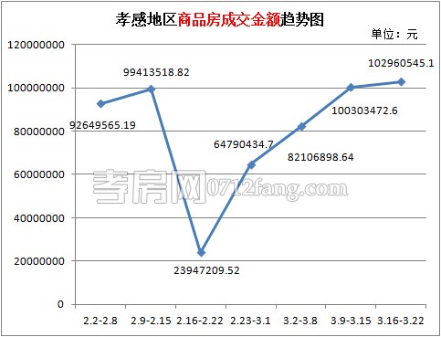 從2015年3月16日到2015年3月22日,孝感區(qū)域商品房成交金額為102960545.1元。商品房成交均價(jià)沒有大幅波動(dòng),但隨著成交套數(shù)的穩(wěn)步增長(zhǎng),成交總金額也持續(xù)上漲,上周商品房成交總金額再創(chuàng)新高,對(duì)比前一周環(huán)比上漲2.6%。孝感樓市3月滿血復(fù)活,實(shí)現(xiàn)樓市“小陽春”。