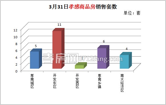 3月31日,全市的銷售套數(shù)為27套。其中孝南城區(qū)為5套,開發(fā)東區(qū)為11套,開發(fā)西區(qū)為1套,孝南鄉(xiāng)鎮(zhèn)為6套,南大經(jīng)濟(jì)區(qū)為4套。
