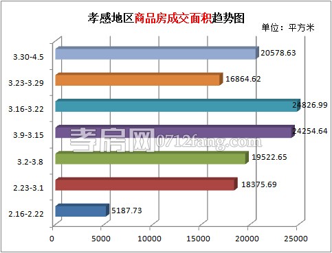 據(jù)孝房網(wǎng)數(shù)據(jù)研究顯示,從2015年3月30日到2015年4月5日,孝感地區(qū)銷售總交易記錄200套,面積為20578.63平方米,金額為91827306.78元,均價為4462.27元/平方米。