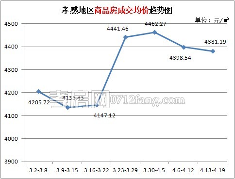 從2015年4月13日到2015年4月19日,孝感區(qū)域商品房成交均價(jià)4381.19元/平方米。成交均價(jià)趨勢(shì)圖顯示,樓市進(jìn)入三月后商品房成交均價(jià)變化幅度較大,在兩會(huì)導(dǎo)向和央行降息的雙重作用下,成交均價(jià)上升走勢(shì)明顯。上周商品房成交均價(jià)對(duì)比前一周雖小幅下降,但總體來(lái)看,商品房成交均價(jià)還是呈上漲趨勢(shì),不管怎樣,孝感樓市庫(kù)存高是不的事實(shí),在此大背景下房?jī)r(jià)缺乏顯著上漲基礎(chǔ),小編覺(jué)得今年房?jī)r(jià)上行空間應(yīng)該不會(huì)太大。