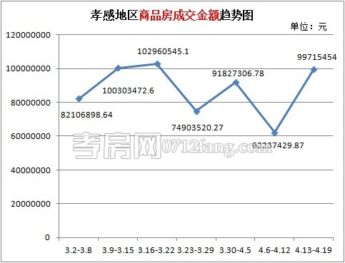 從2015年4月13日到2015年4月19日,孝感區(qū)域商品房成交金額為99715454元,對(duì)比前一周約上漲60.22%,近期高成交總額相差3245091.1元,這是否意味著,隨著政策定向?qū)捤?,市?chǎng)去庫(kù)存速度出現(xiàn)加快,市場(chǎng)信心將得以提振。