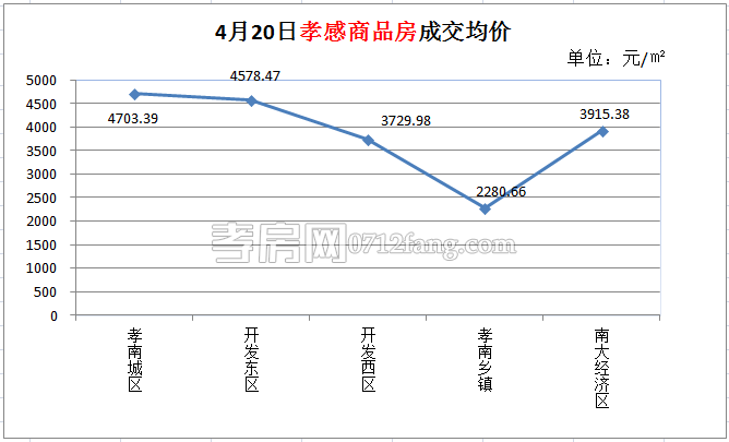 4月20日,全市的成交均價為4505.40元/㎡。其中開孝南城區(qū)為4703.39元/㎡,開發(fā)東區(qū)為4578.47元/㎡,開發(fā)西區(qū)為3729.98元/㎡,孝南鄉(xiāng)鎮(zhèn)為2280.66元/㎡,南大經濟區(qū)為3915.38元/㎡。