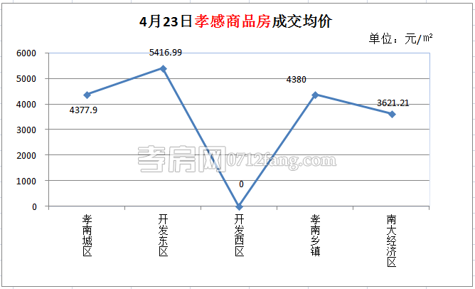 4月23日,全市的成交均價為4516.10元/㎡。其中開孝南城區(qū)為4377.90元/㎡,開發(fā)東區(qū)為5416.99元/㎡,孝南鄉(xiāng)鎮(zhèn)為4380.00元/㎡,南大經(jīng)濟(jì)區(qū)為3621.21元/㎡。