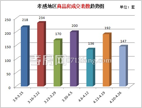 從2015年4月20日到2015年4月26日,孝感地區(qū)商品房成交147套。縱觀“金三銀四”,商品房成交套數(shù)做起了俯臥撐,變化幅度較大,總體來說呈下滑趨勢。上周商品房出量147套,對比前一周環(huán)比下降23.43%,成交套數(shù)有所下降。