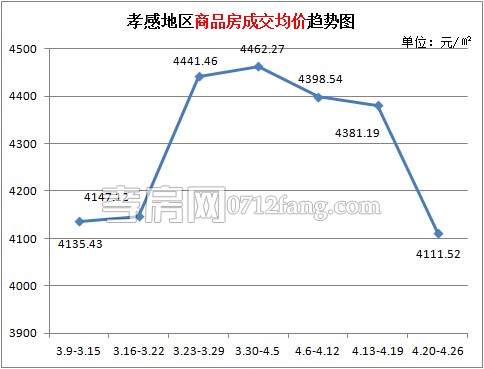 從2015年4月20日到2015年4月26日,孝感區(qū)域商品房成交均價4111.52元/平方米。商品房成交均價趨勢圖顯示近2個月新房套均價在411.52~4462.27元/平方米之間浮動變化,且幅度較大。4月初新房均價創(chuàng)新高,歷經(jīng)一個月,商品房成交均價再次大幅下滑,與三月上旬房價持平。上周商品房成交均價為4111.52元/平方米,對比前一周約下降了6.16%,房價的下降并沒有引起成交套數(shù)的上漲,購房者消費似乎越發(fā)理性。