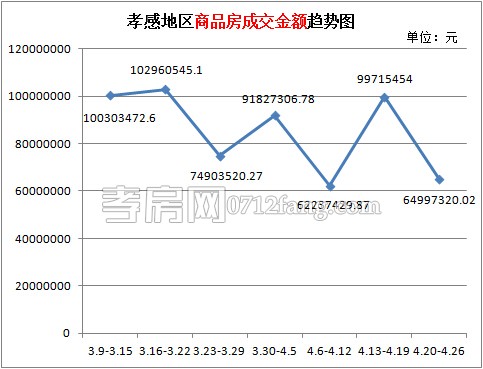 從2015年4月20日到2015年4月26日,孝感區(qū)域商品房成交金額為64997320.02元,對比上一周環(huán)比下降34.82%,由于量價齊降,導(dǎo)致商品房成交總金額明顯下降。