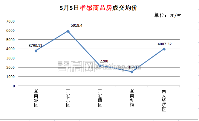 5月5日,全市的成交均價為3793.11元/㎡。其中開孝南城區(qū)為3793.11元/㎡,開發(fā)東區(qū)為5918.40元/㎡,開發(fā)西區(qū)為3630.00元/㎡,孝南鄉(xiāng)鎮(zhèn)為2200.00元/㎡,南大經(jīng)濟區(qū)為4007.32元/㎡。