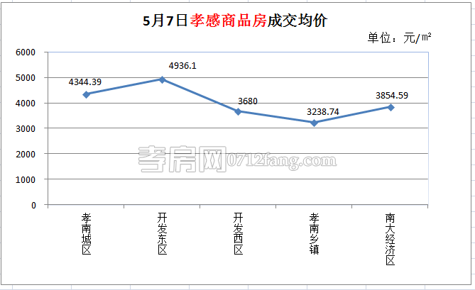 5月7日,全市的成交均價(jià)為4180.43元/㎡。其中開孝南城區(qū)為4344.39元/㎡,開發(fā)東區(qū)為4936.10元/㎡,開發(fā)西區(qū)為3680.00元/㎡,孝南鄉(xiāng)鎮(zhèn)為3238.74元/㎡,南大經(jīng)濟(jì)區(qū)為3854.59元/㎡。