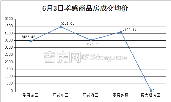6月3日,全市的成交均價為4126.45元/㎡。其中開孝南城區(qū)為3463.48元/㎡,開發(fā)東區(qū)為4451.45元/㎡,開發(fā)西區(qū)為3525.53元/㎡,孝南鄉(xiāng)鎮(zhèn)為4102.14元/㎡。