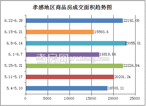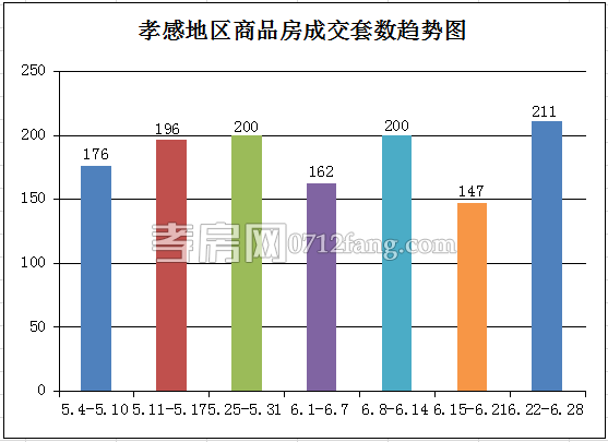從2015年6月22日到2015年6月28日,孝感地區(qū)銷售總交易記錄211套,環(huán)比上周(147套)上升43.54%;成交均價5620.09元/平方米,環(huán)比上周(4840.53元/平方米)上升16.10%;成交面積對比上周(15593.6)上升42.32%;成交總金額環(huán)比上升65.23%。