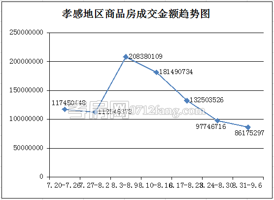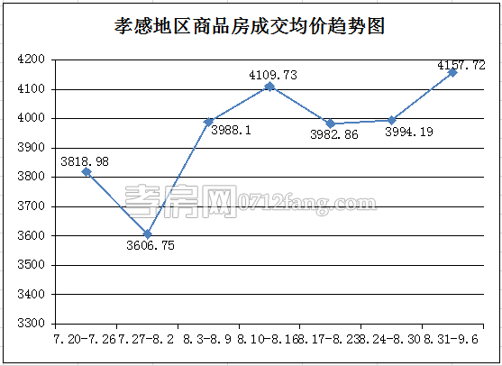 據(jù)孝房網(wǎng)數(shù)據(jù)研究顯示,從2015年8月31日到2015年9月6日,孝感地區(qū)銷售總交易記錄199套,面積為20726.59平方米,金額為86175297.17元,均價為4157.72元/平方米。