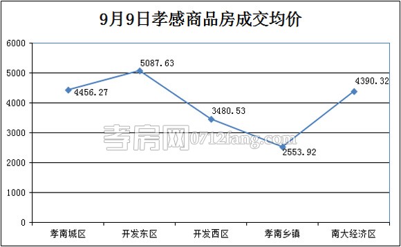9月9日,全市的成交均價(jià)為4545.42元/㎡。其中開孝南城區(qū)為4456.27元/㎡,開發(fā)東區(qū)為5087.63元/㎡,開發(fā)西區(qū)為3480.53元/㎡,孝南鄉(xiāng)鎮(zhèn)為2553.92元/㎡,南大經(jīng)濟(jì)區(qū)為4390.32元/㎡。