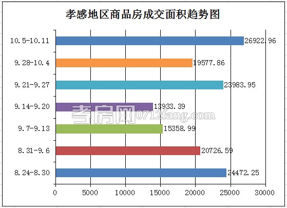 從2015年10月5日到2015年10月11日,孝感地區(qū)銷售總交易記錄211套,環(huán)比上周(194套)上升8.76%;成交均價2962.68元/平方米,環(huán)比上周(4446.61元/平方米)下降33.37%;成交面積26922.96平方米,環(huán)比上周(19577.86)上升37.52%;成交總金額環(huán)比下降8.38%。