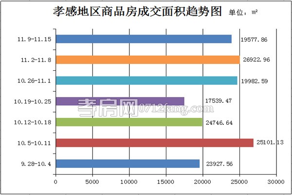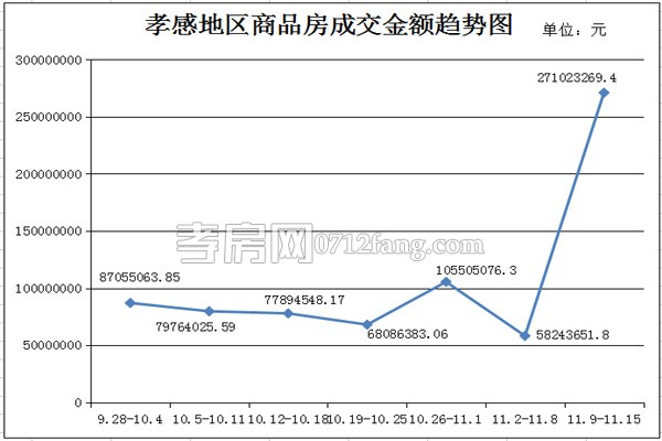 從2015年11月9日到2015年11月15日,孝感地區(qū)銷(xiāo)售總交易記錄196套,環(huán)比上上周(229套)下降14.41%;成交均價(jià)11326.82元/平方米,是上上周(4263.41元/平方米)1.66倍;成交面積23927.56平方米,環(huán)比上上周(24746.64平方米)下降3.31%;成交總金額是上上周的3.65倍。